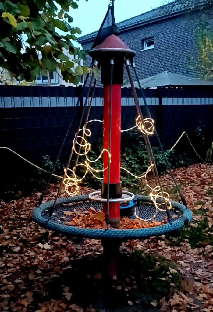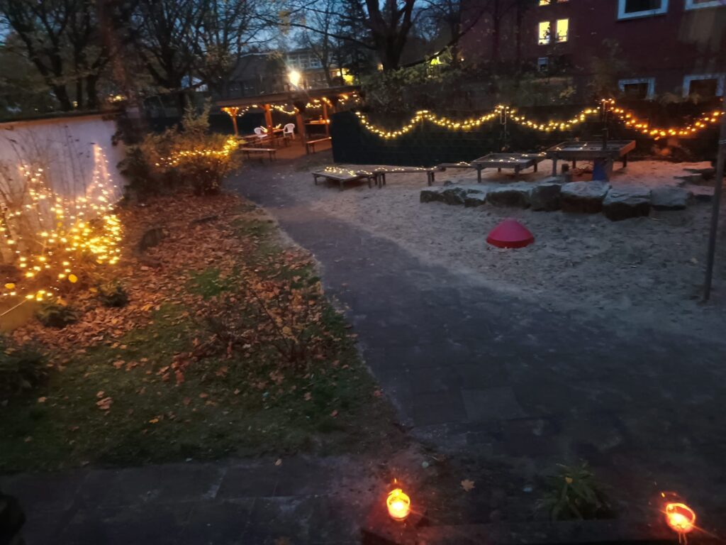 Das Laternenfest findet in der Kita statt. Ab mittags wird der Garten des Kindergartens mit vielen Licherketten festlich geschmückt. Die Eltern kommen am Nachmittag mit den Kindern in die Einrichtung. Der Höhepunkt für die Kinder besteht aber darin, endlich ihre selbst gebastelten Laternen an den Stab hängen zu können und einen kleinen Umzug zu machen. Laut singend ziehen wir durch die Dorstener Straßen.